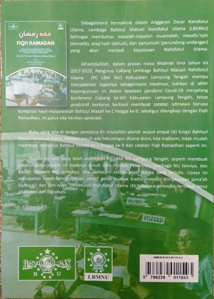 Lampung Tengah- Hadirnya buku ini adalah salah satunya sebagai wujud dari realisasi program kegiatan para Pengurus Cabang (PC) Lembaga Bahtsul Masail Nahdlatul Ulama (LBM NU) Kabupaten Lampung Tengah masa khidmat 2017-2022. Buku ini hadir dalam merespon permintaan dari berbagai elemen jamaah dan jamiyyah perkumpulan Nahdlatul Ulama seputar fenomena keagamaan sehari-hari dimasyarakat yakni tentang puasa dan zakat fitrah, sekaligus pendapat para ulama lintas madzhab Imam Syafi’i sebagai solusi masalah yang berkembang di masyarakat, selain itu, buku ini juga menghadirkan tema-tema aktual yang dibahas dalam forum LBM NU Kabupaten Lampung Tengah yang terbagi dalam 9 pertemuan.